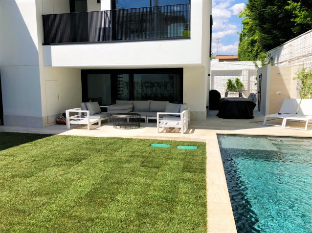 Se diseño una piscina correspondiente con la estética de la vivienda, con un color muy similar, que no desentonará con el resto de la residencia. El diseño de la piscina es vanguardista y alargado.
